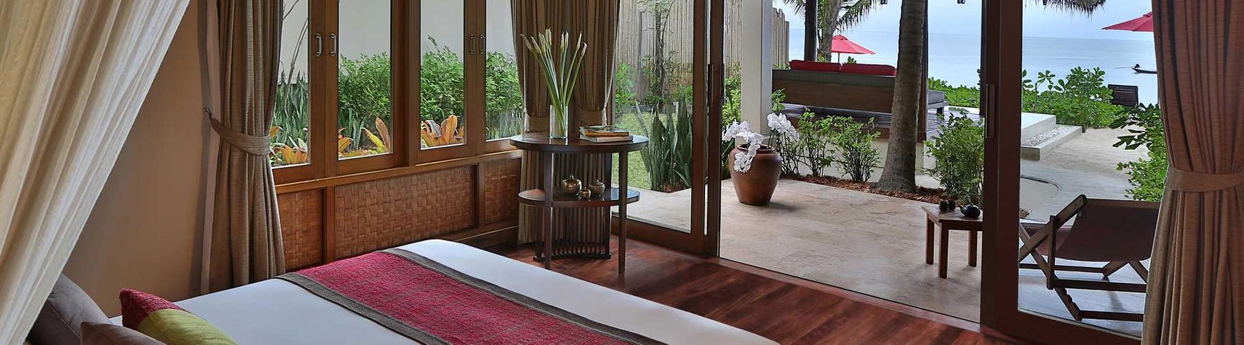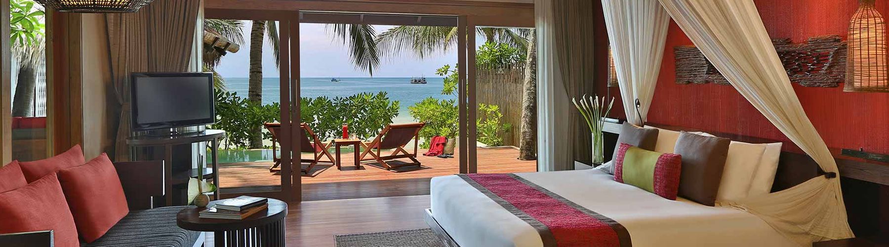 Современные 64 номера и роскошные виллы отеля оформлены с использованием традиционных тайских элементов дизайна. Они гармонично вписываются в окрестные пейзажи, предлагая гостям атмосферу эксклюзивности и утонченной элегантности. Перед каждой виллой раскинулся белый песчаный пляж, один из лучших в Таиланде.