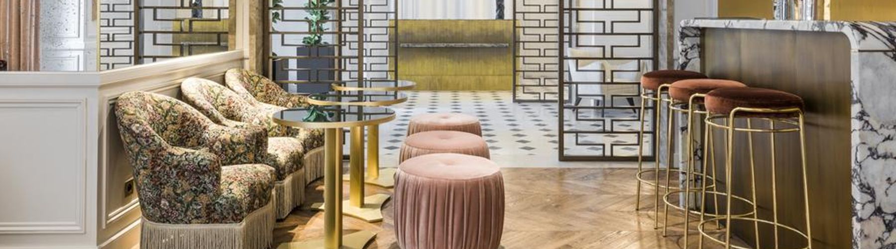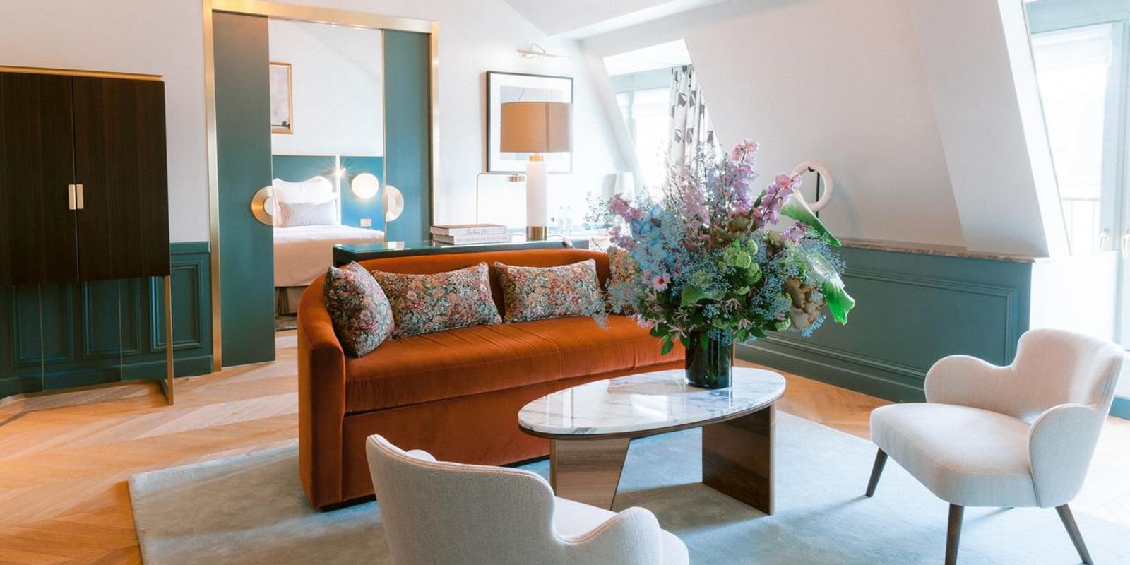 В отеле 50 номеров, которые оформлены в духе парижского шика: с лепными украшениями и каминами. Их интерьеры выполнены в разной цветовой гамме: розовой, зелено-голубой или голубой.