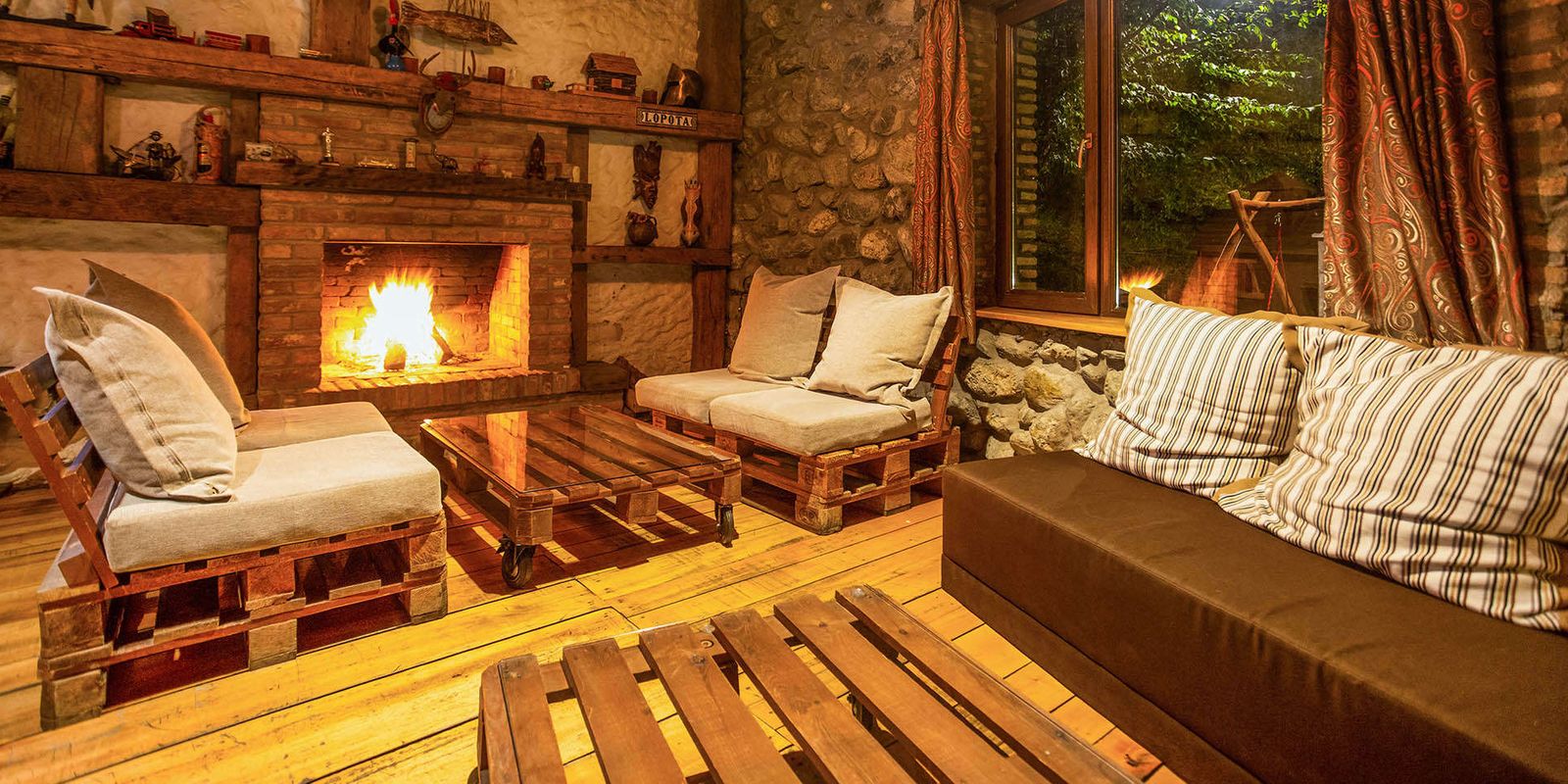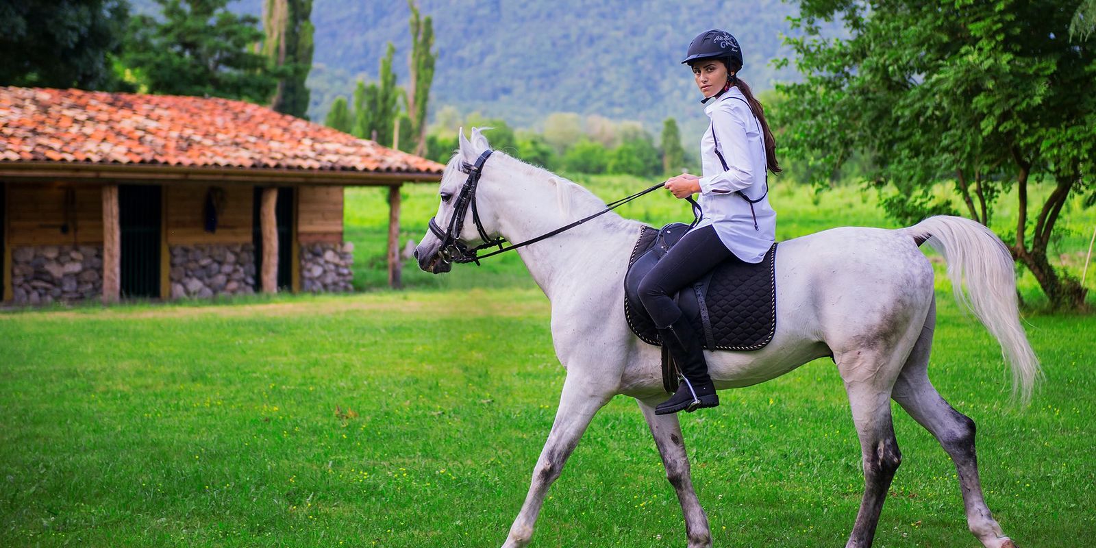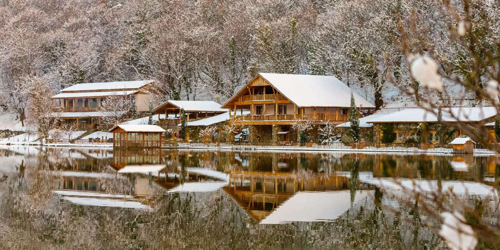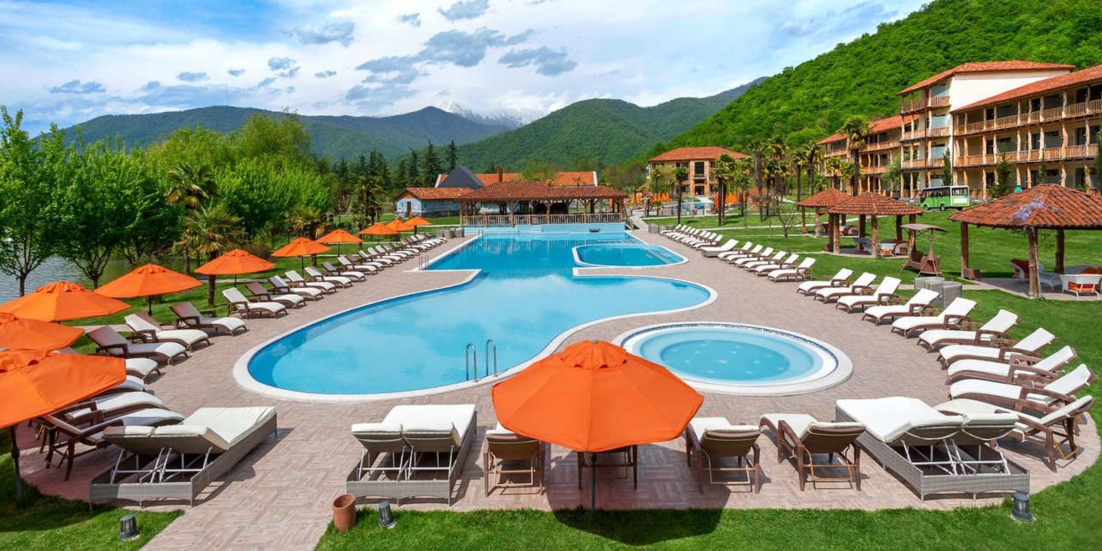 Отель занимает 14 строений вокруг озера, из окон которых открываются чарующие виды на водоем, живописные леса и Кавказский хребет.