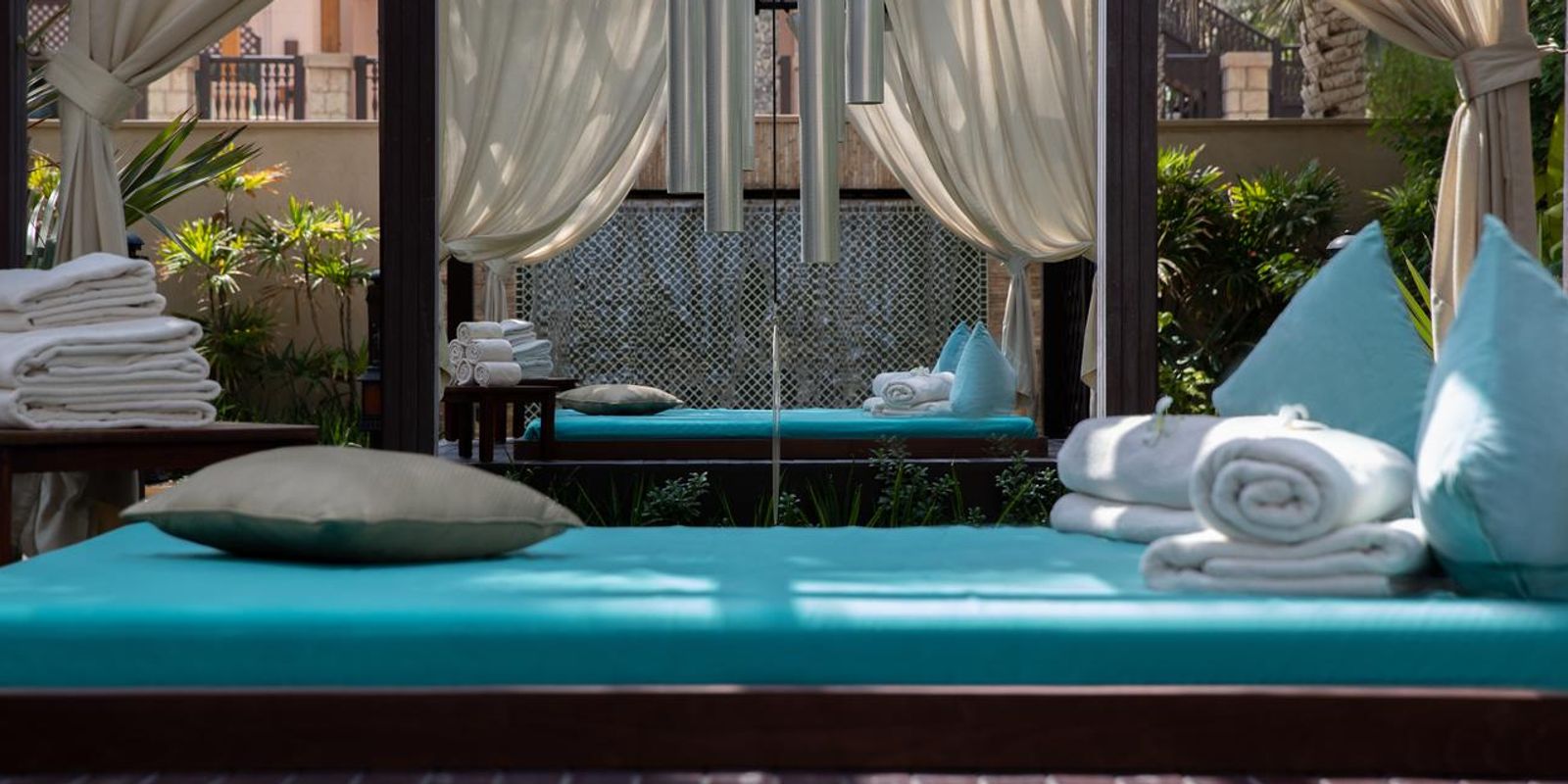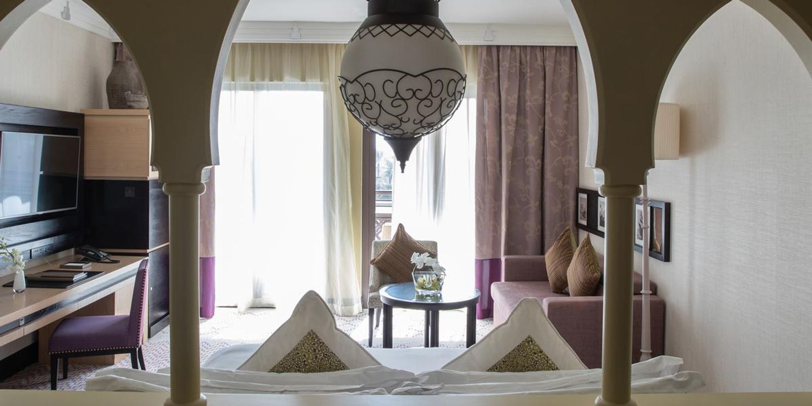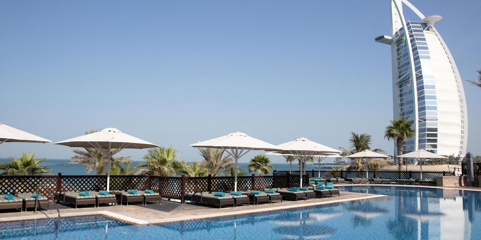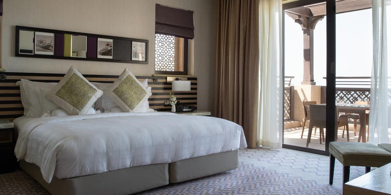 Номера оформлены в традиционном арабском стиле, с балкона каждого открывается вид на море. На территории работает более 40 ресторанов, баров и лаунджей, каждый из которых оформлен в индивидуальной тематике.