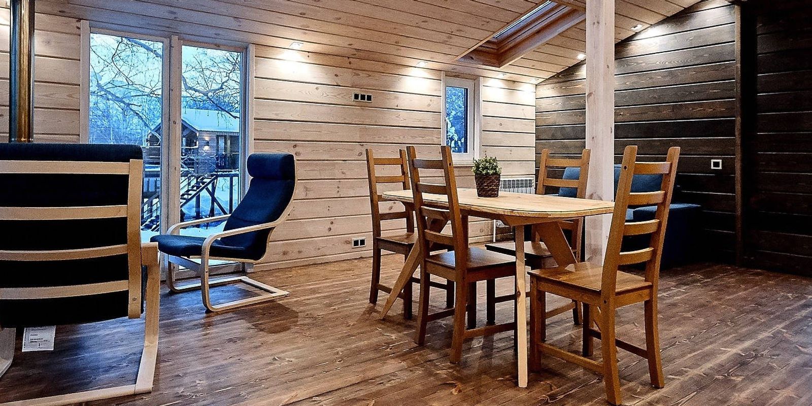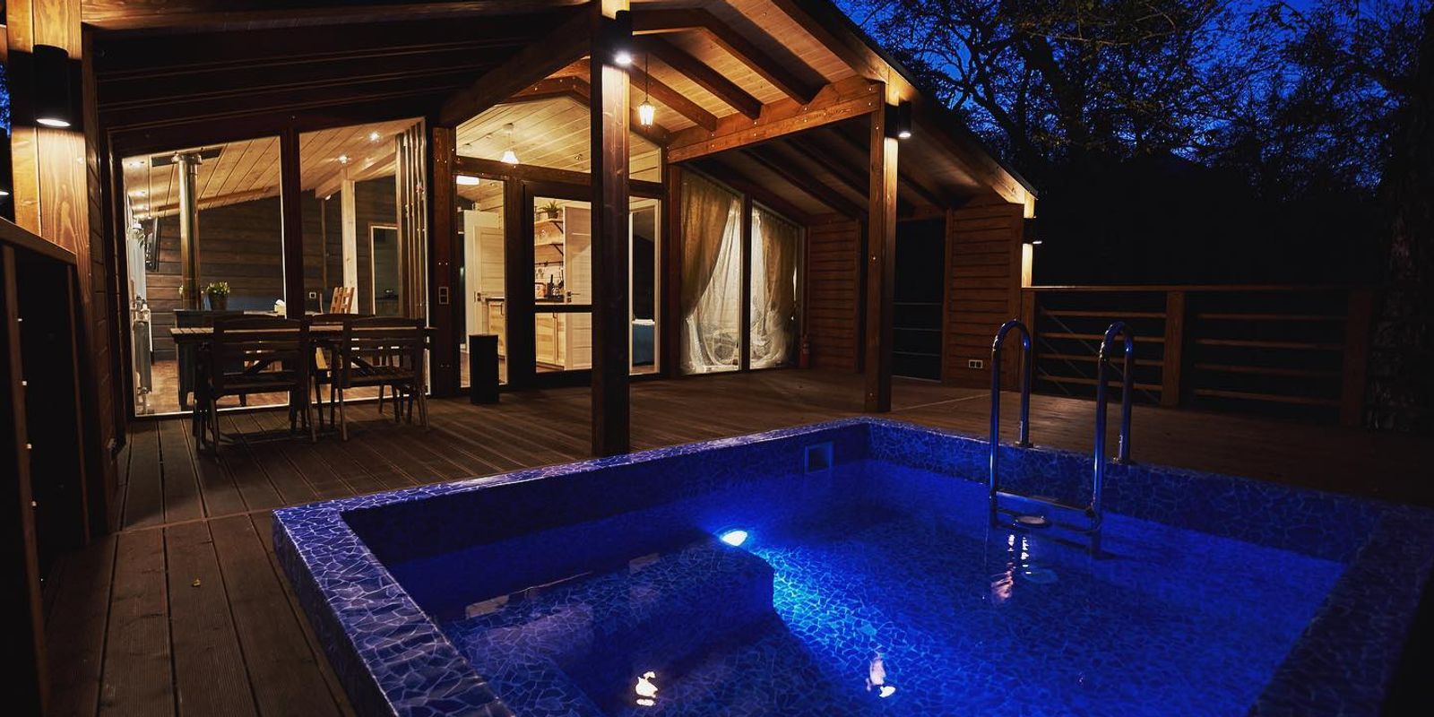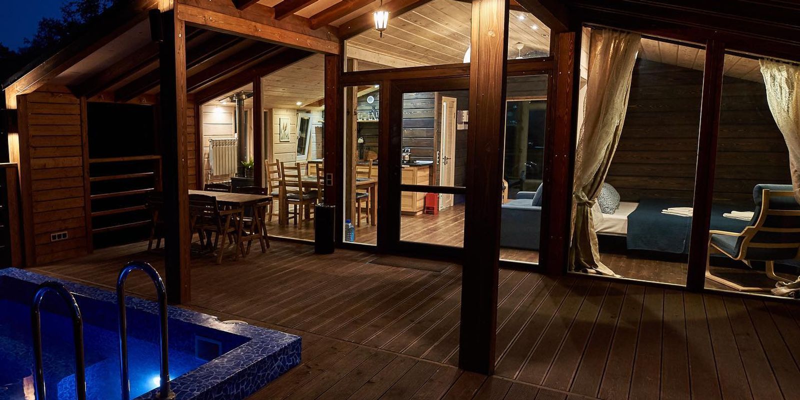 Каждое шале парк-отеля построено в скандинавском стиле, имеет панорамные окна и индивидуальный открытый бассейн с термальной водой.