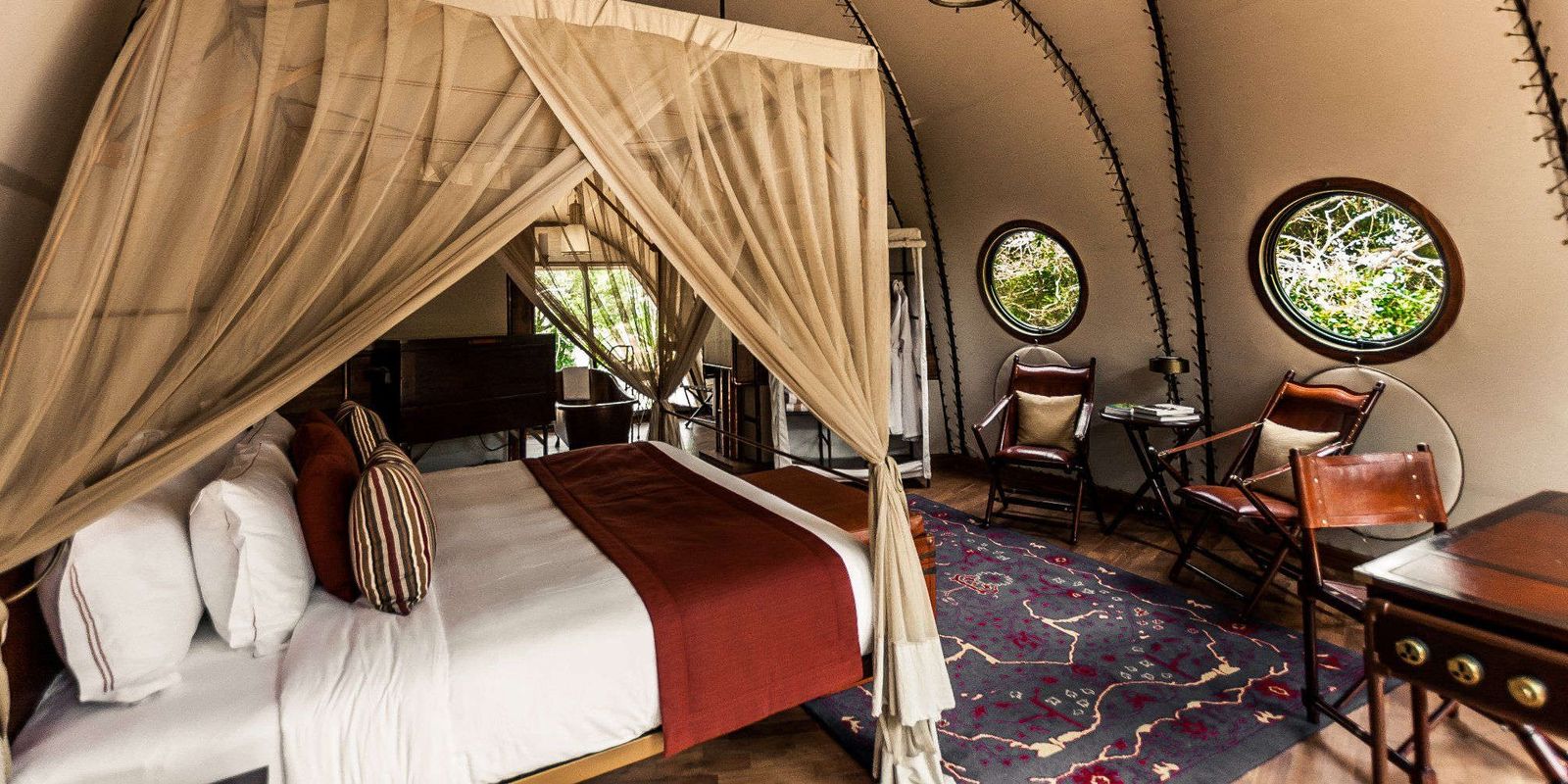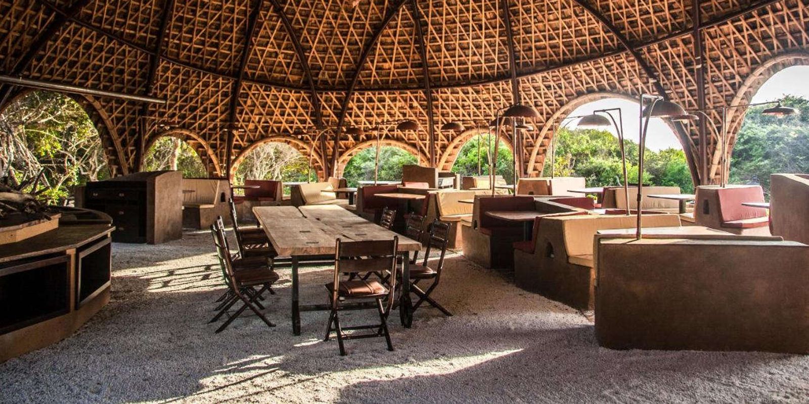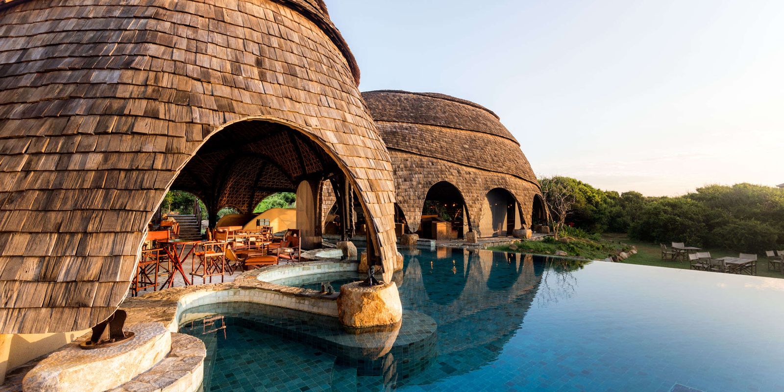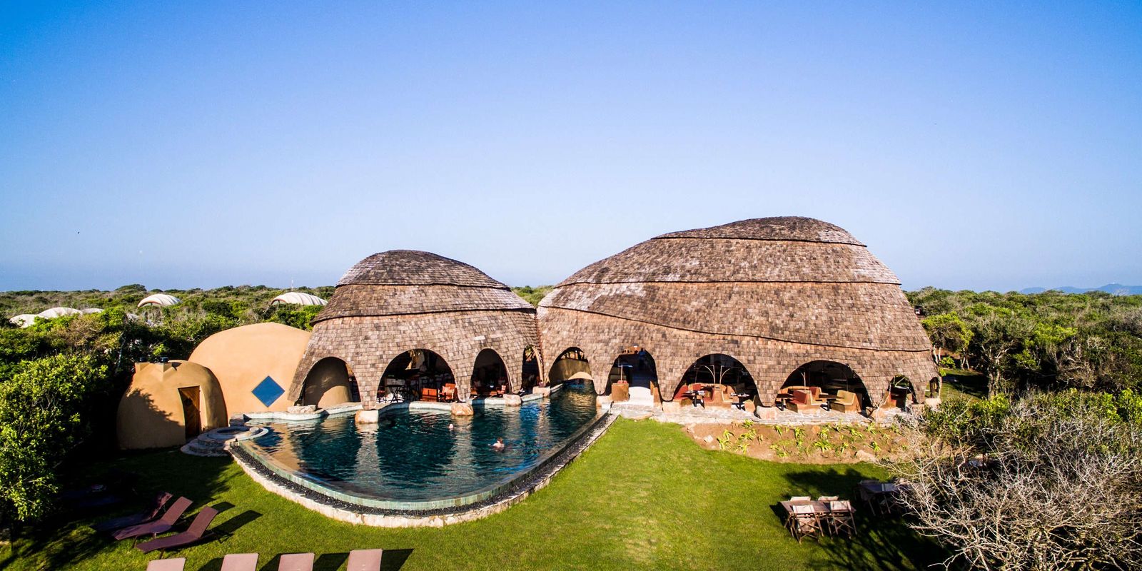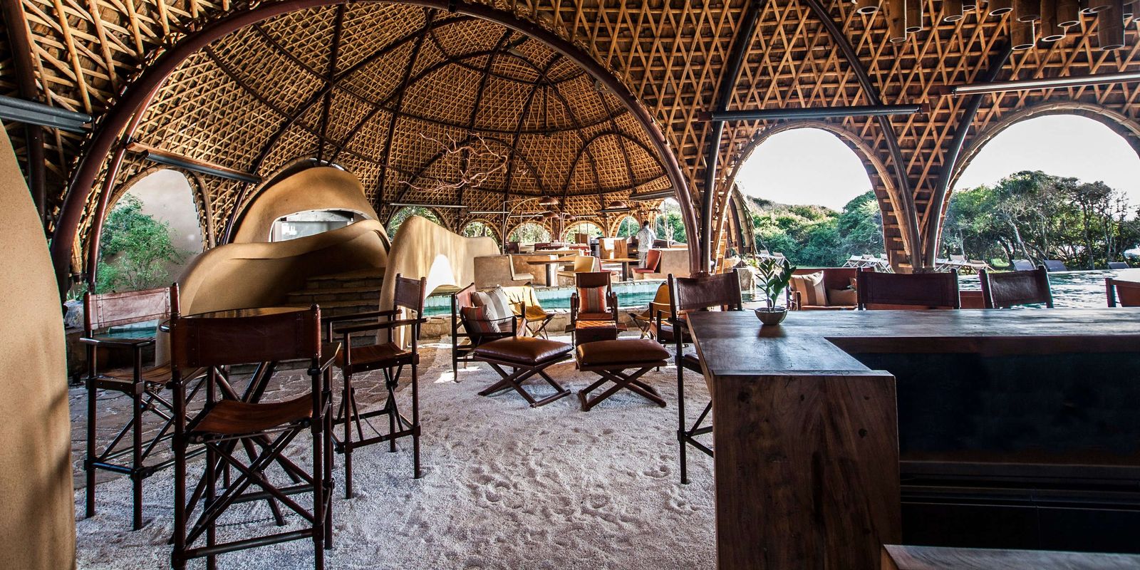 Искусственные сооружения органично вписываются в окружающий ландшафт благодаря применению тщательно подобранных натуральных материалов и уникальному дизайну. Использование арочных тканевых конструкций позволяет каждой из 28 палаток принимать форму и цвет камней и валунов, разбросанных поблизости, в то время как продуманная планировка в форме отпечатка лапы леопарда намекает на самого известного жителя этого района.