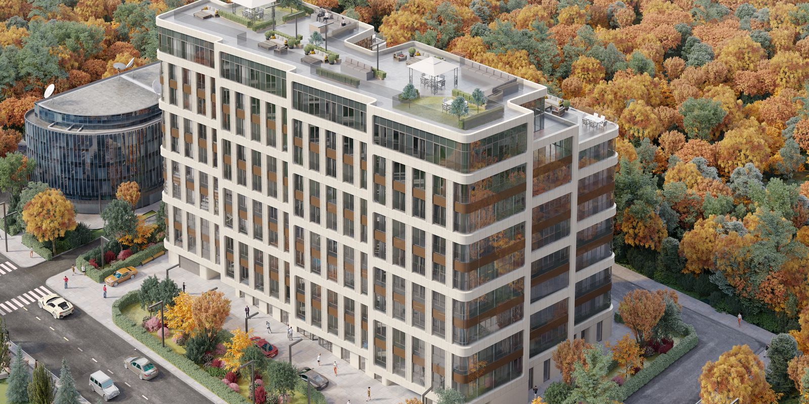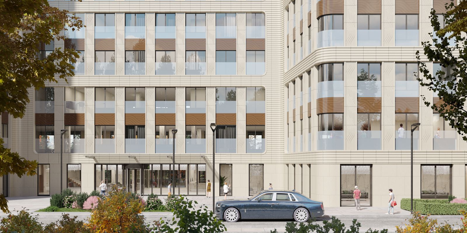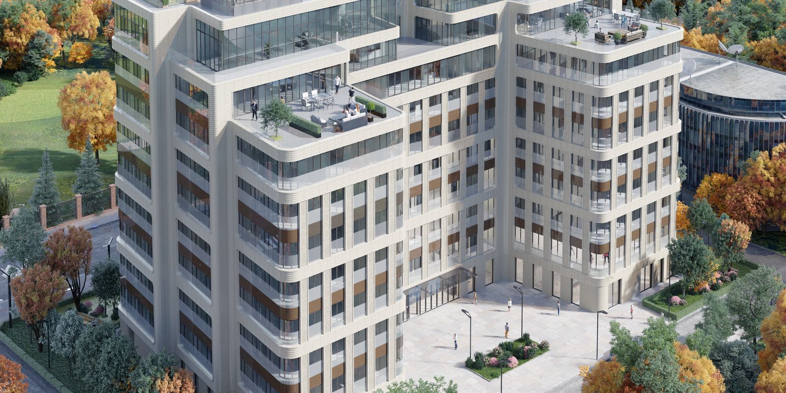 "Мы хотели создать ощущение особняка, дома с индивидуальным адресом, граничащего с мягким природным окружением. Это, конечно, городской проект, но он находится совсем рядом с Московским городским гольф-клубом, там, где улица Довженко плавно переходит в парадный подъезд к гольф-клубу. Дом является элементом городской жизни и частью окружающего природного ландшафта. На северо-восток перед ним находится огромная природная территория, к которой резиденция раскрывается своим дворовым пространством. Можно сказать, что наш дом является точкой соединения энергии города с покоем пейзажного парка."