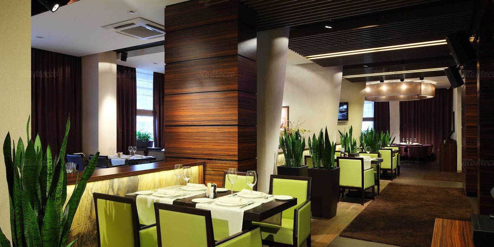 Интерьер ресторана — осовремененная классика: шоколадно-фисташковые стулья полукруглой формы, вместо массивных хрустальных люстр — лаконичные круги с встроенными лампами. Стены украшают художественные произведения и фоторепродукции. Здесь очень много зелени и света, есть открытая кухня.