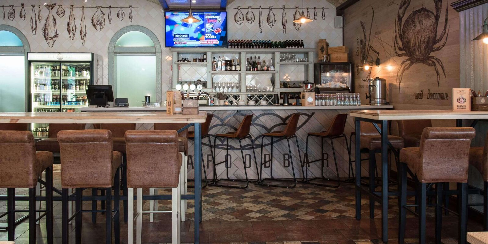 Seafoodbar «Рыба и Крабы» — демократичное заведение без пафосного интерьера и заоблачных цен. Потертые кожаные диваны и стулья, на стенах силуэты рыб, огромные витражные окна с видом на одну из центральных улиц города, открытая кухня. Основной акцент в меню — на отечественную рыбу и морепродукты.