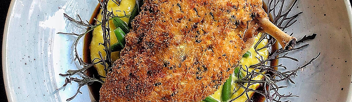 Большинство кушаний готовится на гриле. В меню вы также найдете такие блюда, как лосось с кешью, сливочная морковь и свежий горох или запеченное в медленном огне мясо ягненка с чесночным конфи, баклажанами и кинзой.