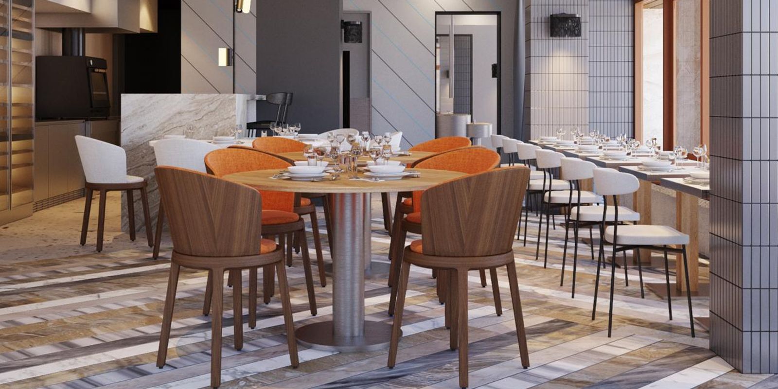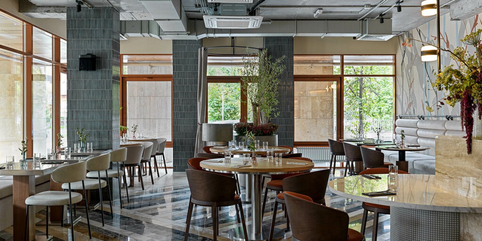«Артель» заняла угловое помещение на первом этаже жилого дома «Легато». За дизайн-проект отвечали Ксения Евстафьева и Ангелина Бородкина. В интерьере элегантно сочетаются разные фактуры (бетон и велюр, мрамор и атлас, железо и дерево) и оттенки (серый, оливковый, бежевый, кирпичный). Окна в пол дают много света утром и днем.
