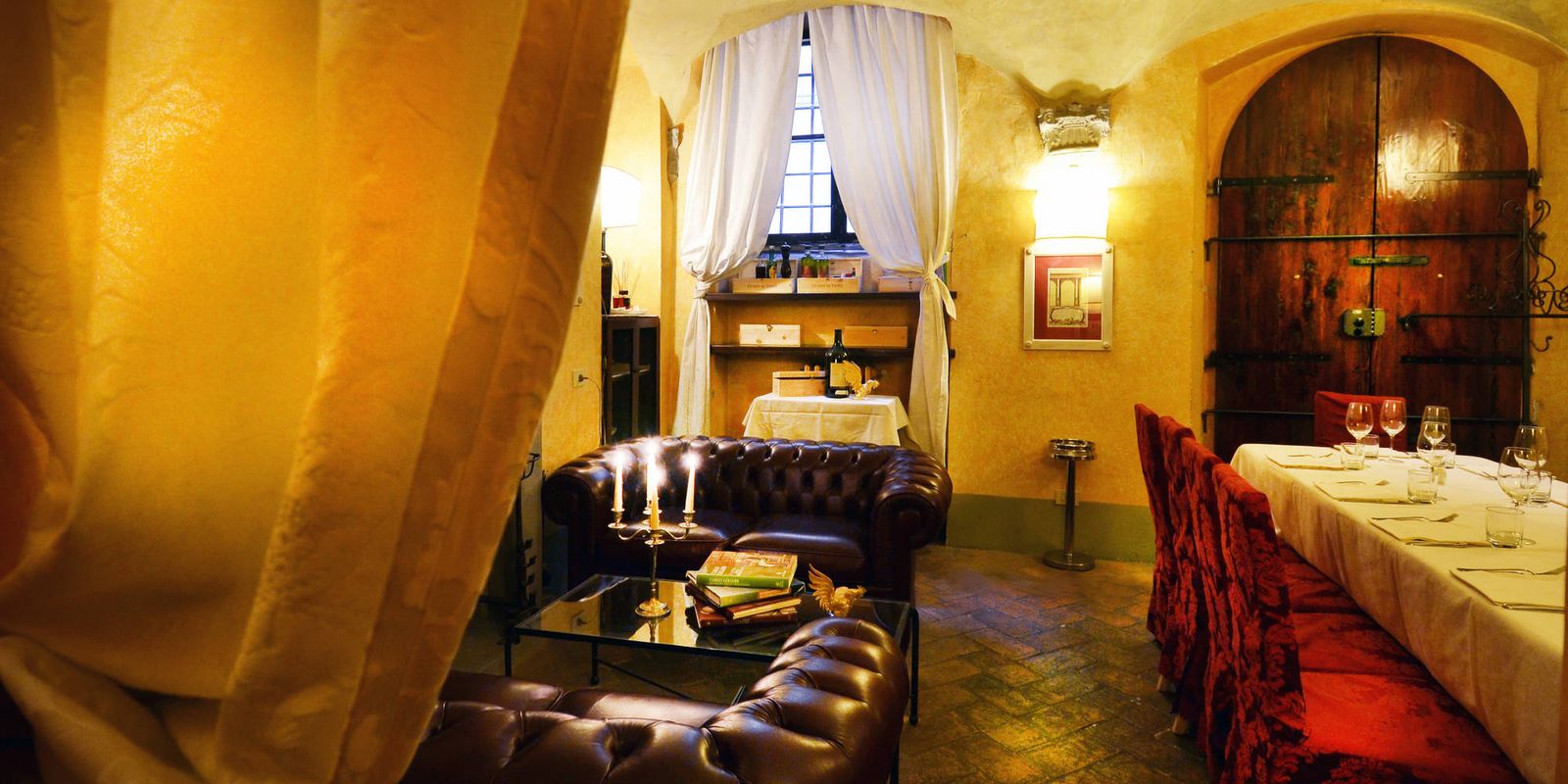 В ресторане вы окунетесь в атмосферу Средневековья: кирпичные стены и арочные своды, элегантная мебель и бархатные портьеры. Изюминка заведения — приватная гостиная с кожаными диванами и большим камином из тосканского песчаного камня.
