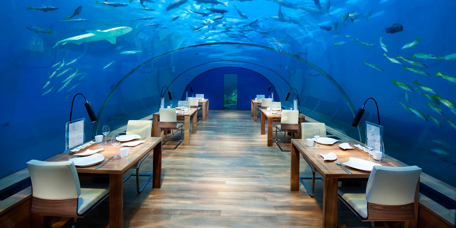 Ресторан Ithaa, окруженный коралловыми садами и юркими хладнокровными рыбами, ожидает отважных любителей экзотики на глубине 16 футов под водой. Здесь подают блюда современной европейской кухни в сопровождении специально подобранных вин.