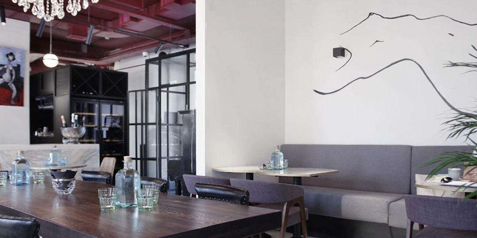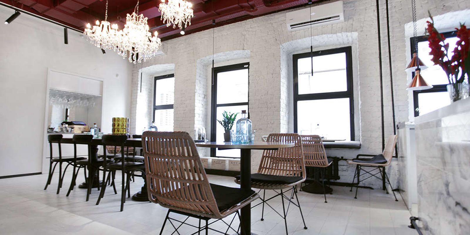 В скромный зал заведения не так просто попасть — бар расположен в арке, и найти его можно по аромату свежей выпечки. Внутри очень светло — белоснежные стены с изящной графикой делают пространство больше, а серый велюр диванов и черная проклепанная кожа кресел смотрятся достаточно контрастно. Зеркало на абсолютно пустой стене отражает барную стойку — бесконтактную, в сером мраморе и с черными стеллажами позади.
