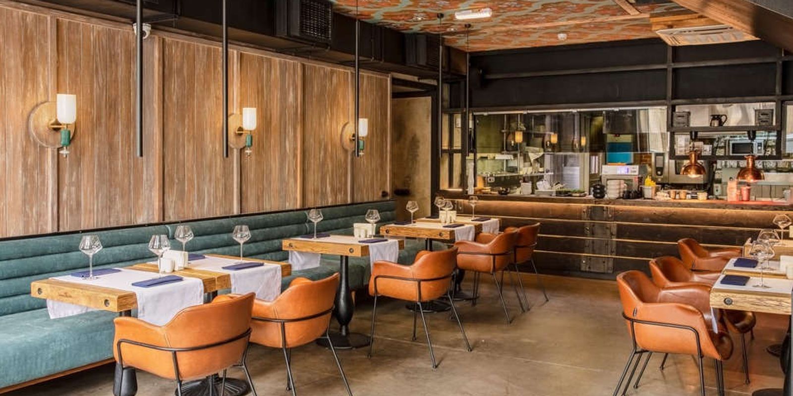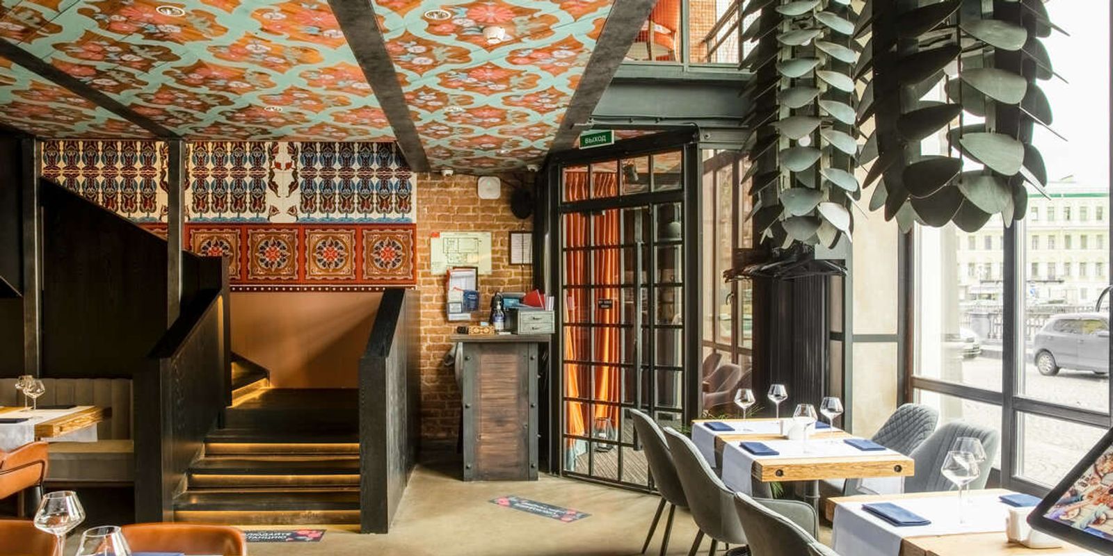 В интерьере двухэтажного ресторана органично сочетаются традиционные русские мотивы и современный грубоватый лофт.