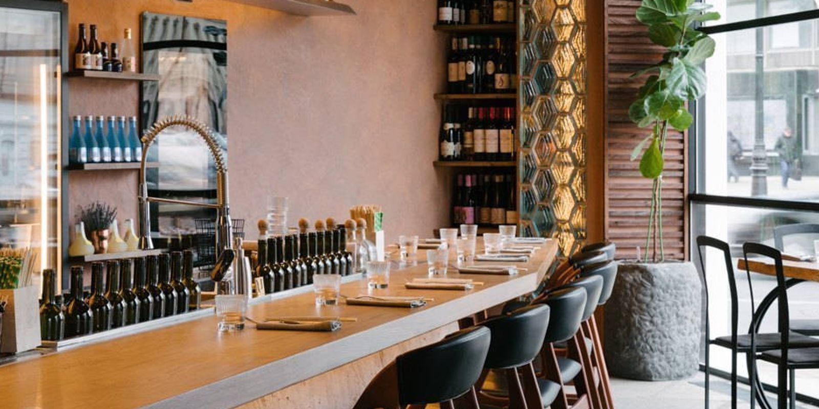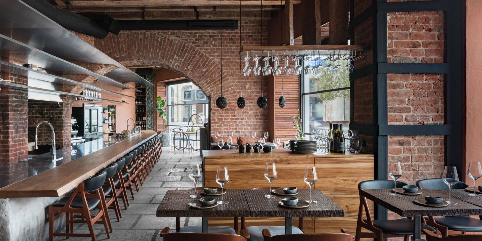 Интерьер заведения выдержан в темных тонах, много дерева и камня. Через весь зал протянулась барная зона.