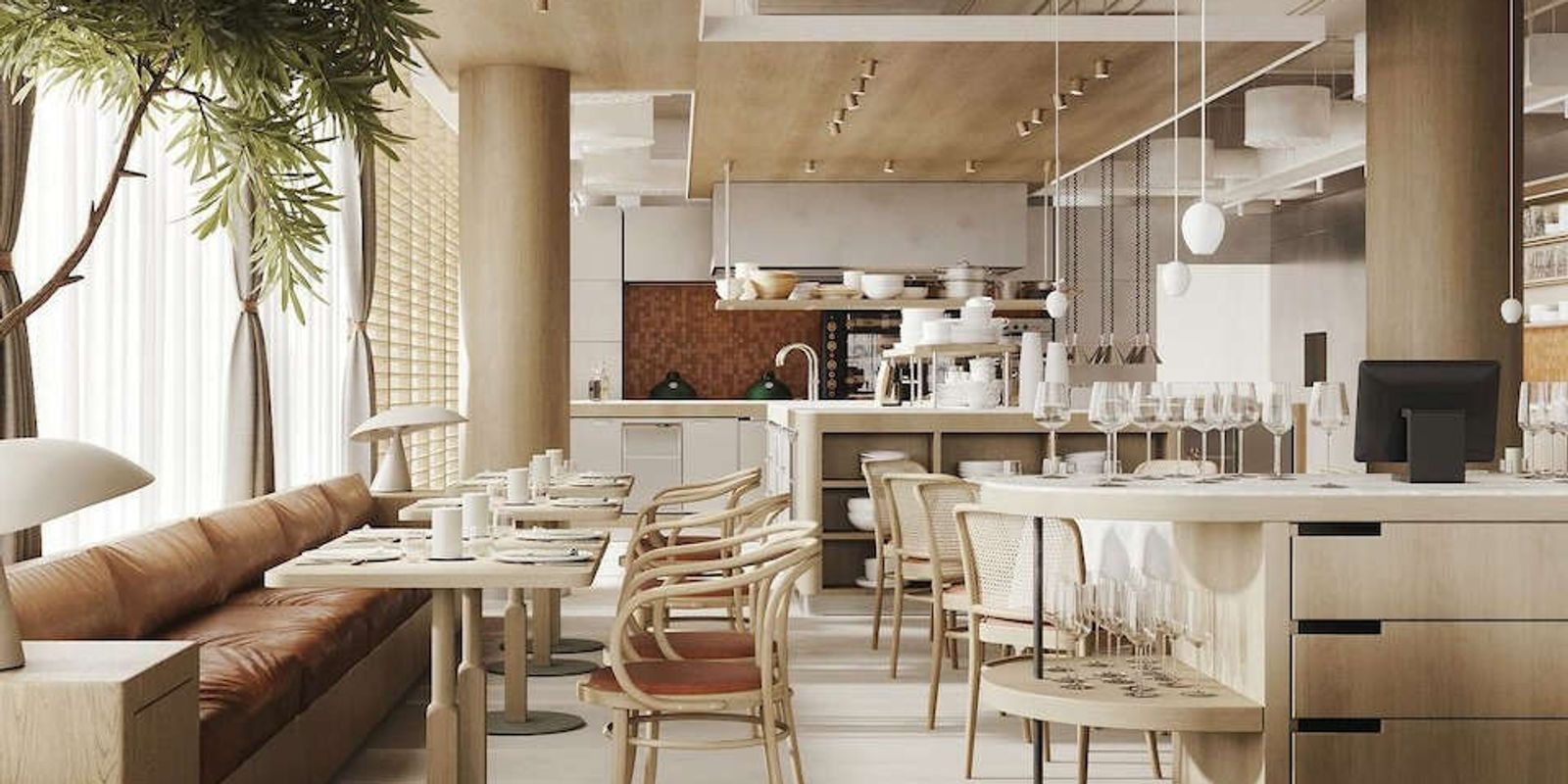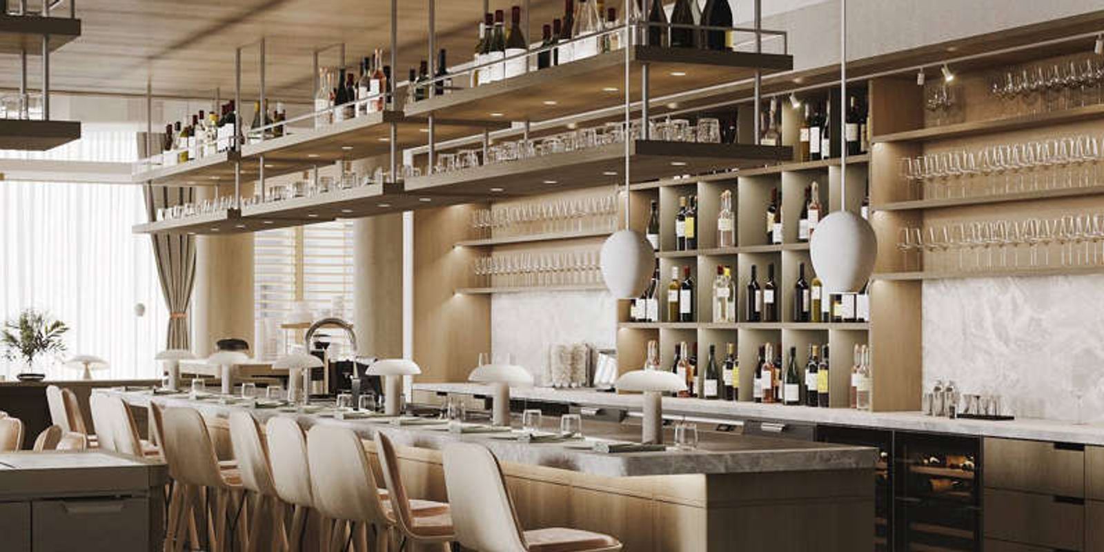 Кухню в зале оставили открытой, дополнительно оборудовав ее десертно-кофейной станцией и барной зоной в два ряда.