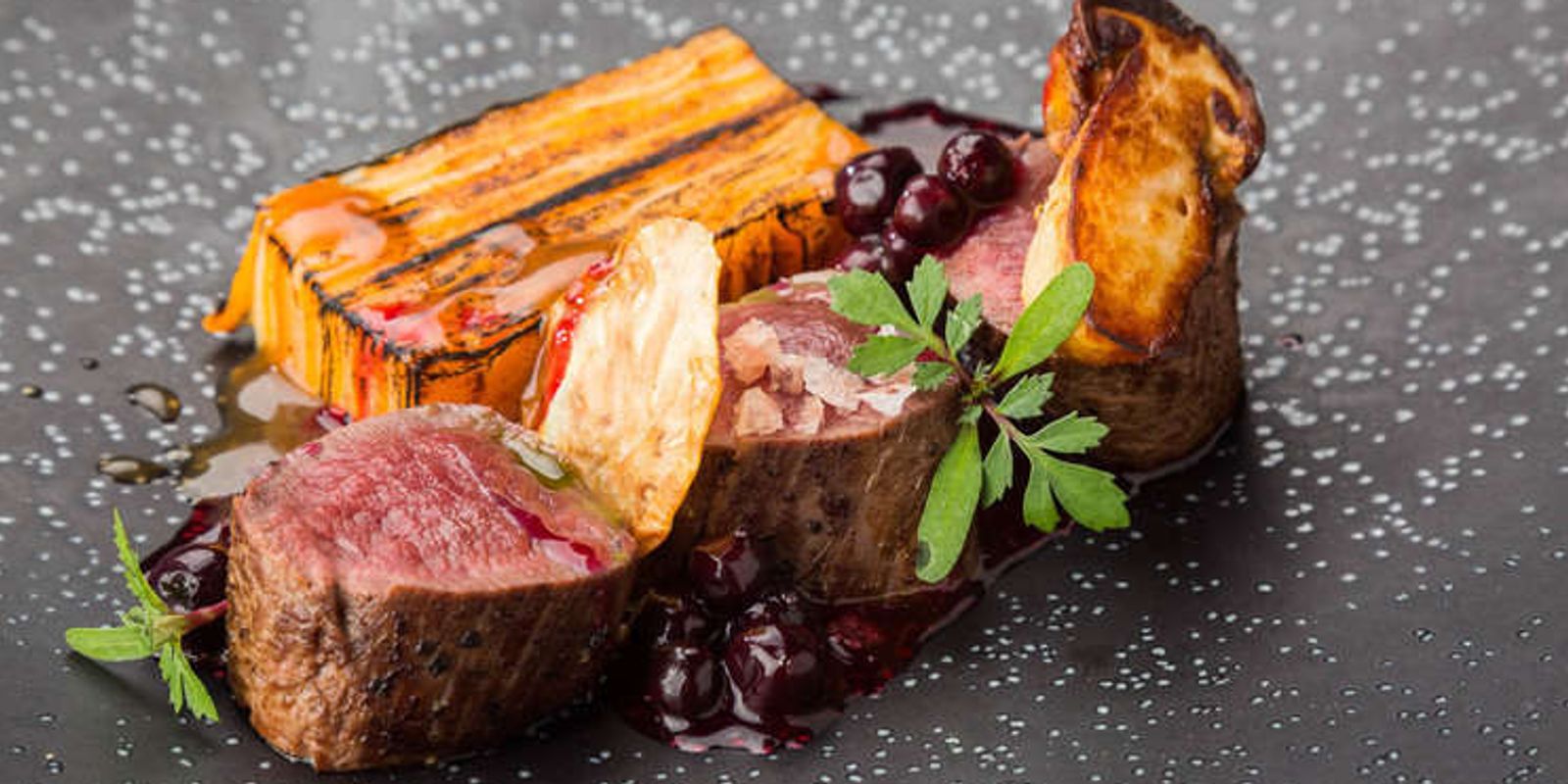 Кухней заведения руководит шеф-повар Юрий Голов (Kempinski). Акцент сделан на рыбе диких пород и морепродуктах, дичи и продуктах от региональных фермеров. Здесь можно попробовать карпаччо из дикой креветки, пельмени с мясом кабана и паштет из кролика. Среди необычных блюд — хвост бобра, котлеты из медведя и десерт с лесными шишками. В ресторане организовали шефс-тейбл, за которым для 11 гостей проводят гастрономические представления.