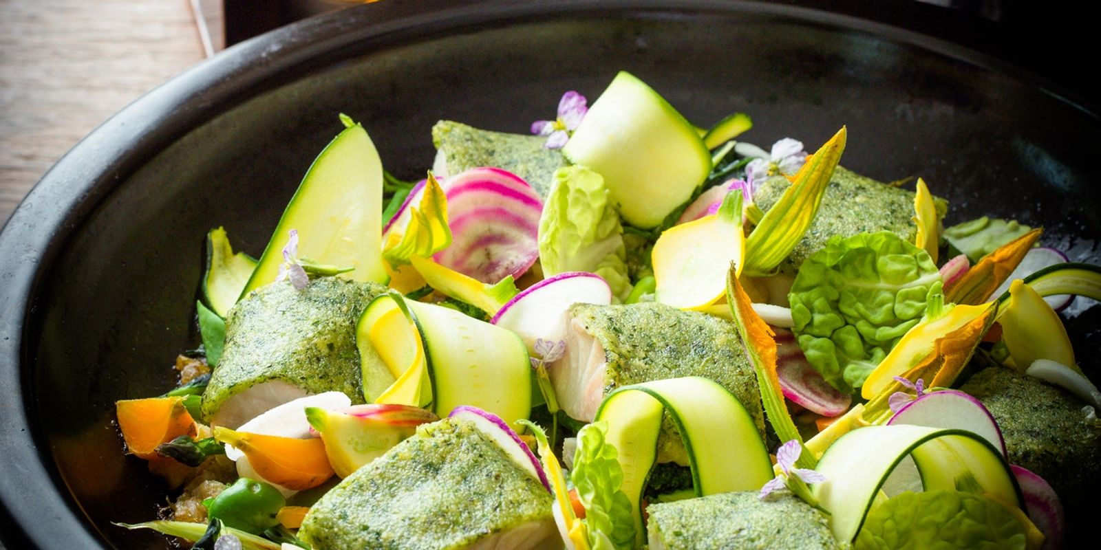 На ужин в SingleThread можно выбрать одно из 11 блюд, включая рыбу и варианты для вегетарианцев. Меню обновляется ежедневно. Дополнить выбранные блюда предлагается вином из погреба на 1800 бутылок.