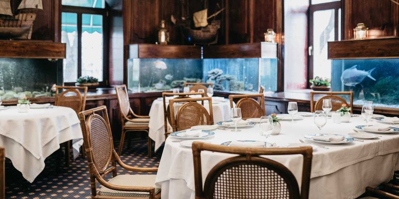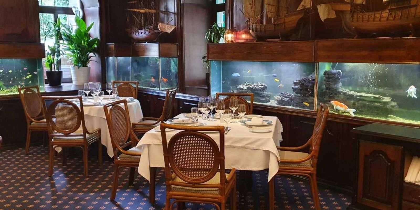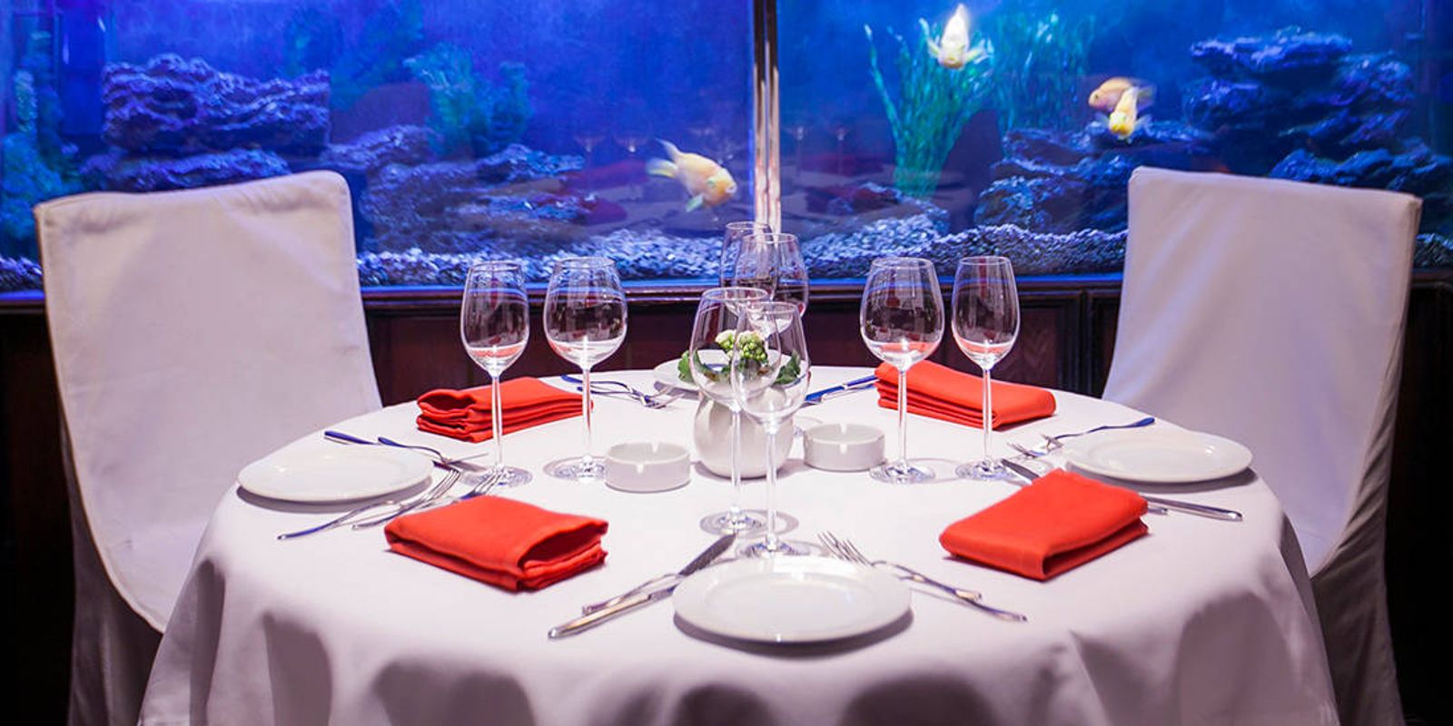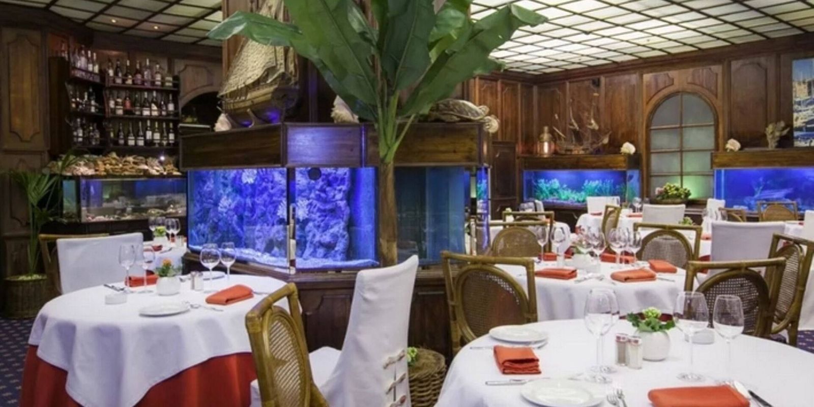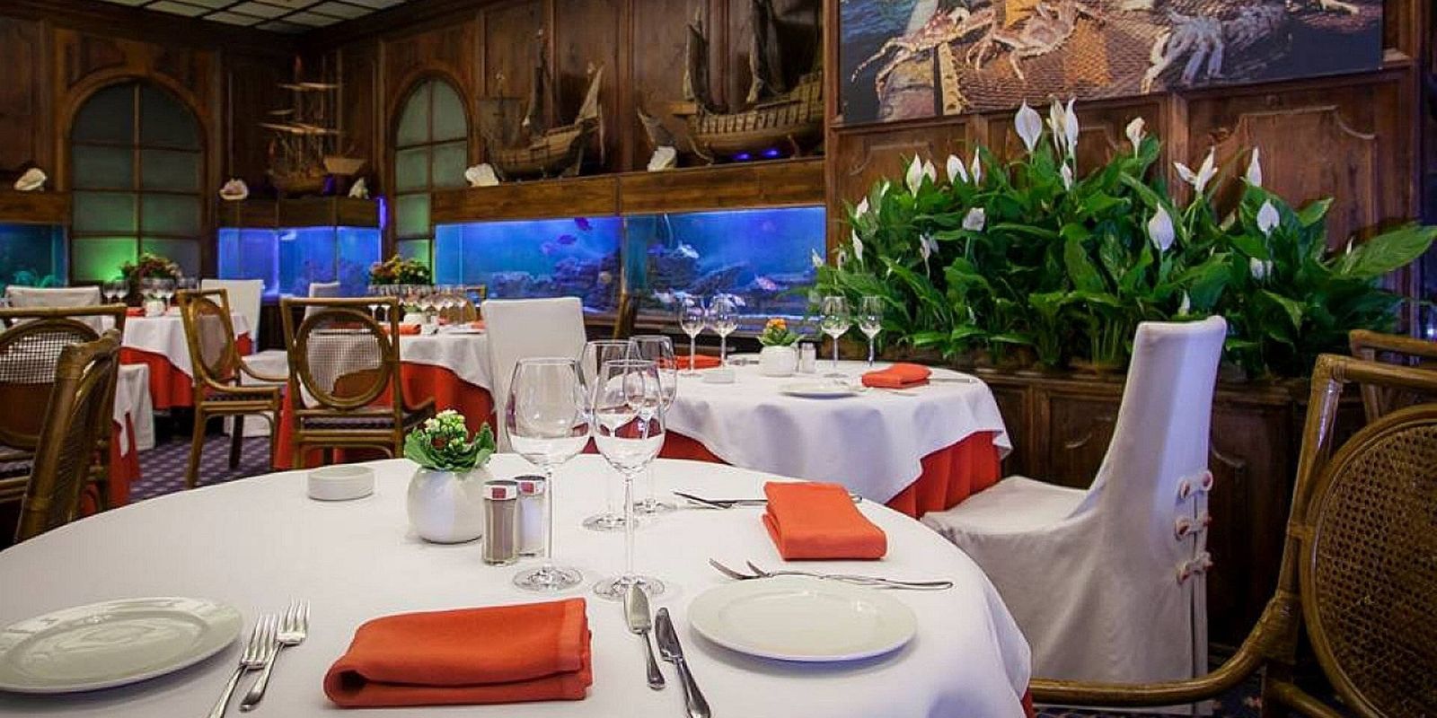 Интерьер оформлен в морском стиле: один из залов, например, имитирует каюту — под прозрачным полом расположился огромный бассейн и рыбы плавают прямо у вас под ногами, вместо окон — иллюминаторы.