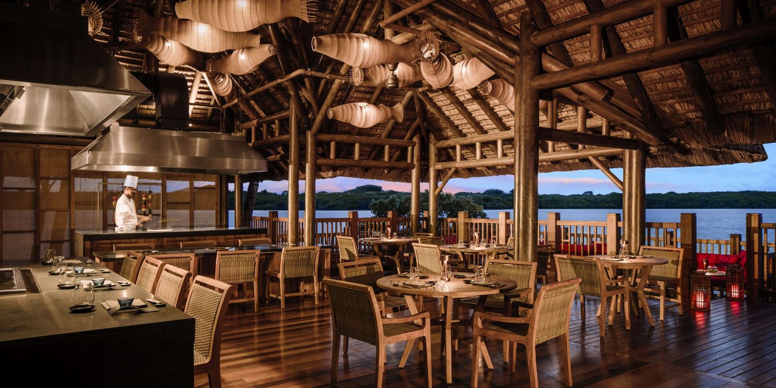 Ресторан возвышается на сваях над бирюзовыми водами лагуны. Оригинальная кухня объединяет в себе концепцию испанских тапас с традиционным японским меню: сашими, севиче, темпура, темпаньяки из свежайших морепродуктов и улова дня. Открытая кухня и большой суши-бар дают возможность наблюдать за мгновенным приготовлением блюд.