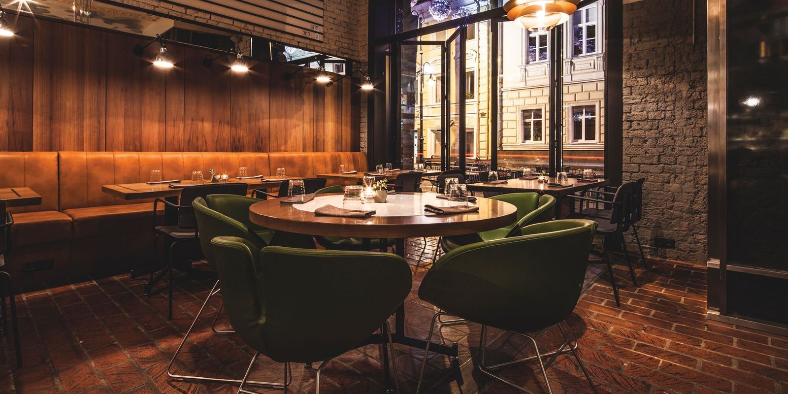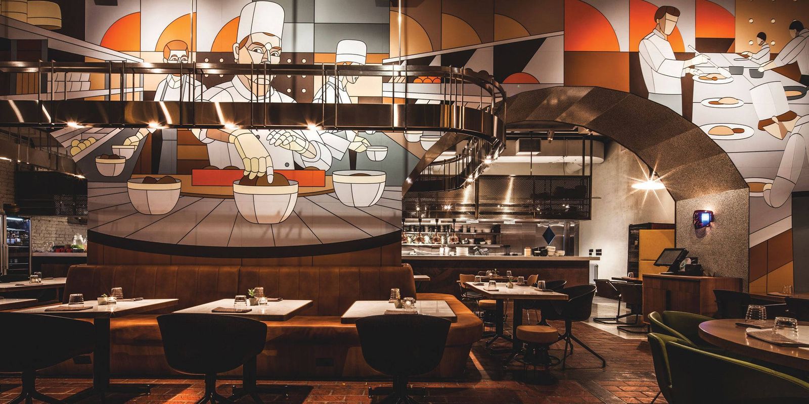 Внутренний облик заведения совместил в себе черты модерна и хай-тека: открытая кухня, стеклянные перегородки, интимно-приглушенный свет.