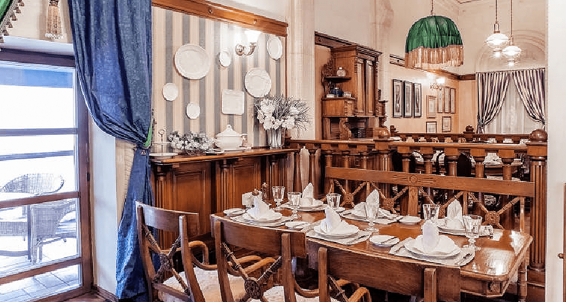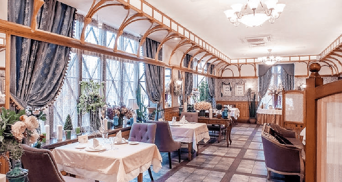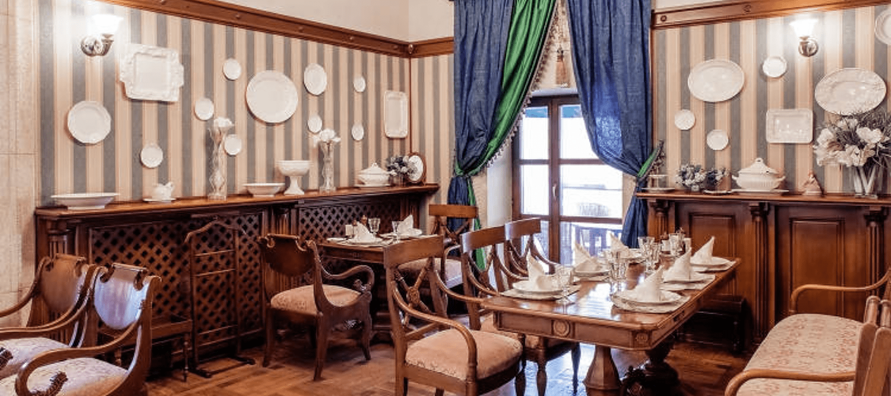 Интерьер ресторана оформлен в духе ХIХ в., в залах собрана мебель в стиле романов Тургенева и Гончарова. Здесь можно организовать званый ужин на 80 персон, пригласив их в парадную гостиную «Троекурова». Русские и французские блюда в ресторане готовят по историческим рецептам. В барной карте — подборка лучших вин из России и со всего мира.